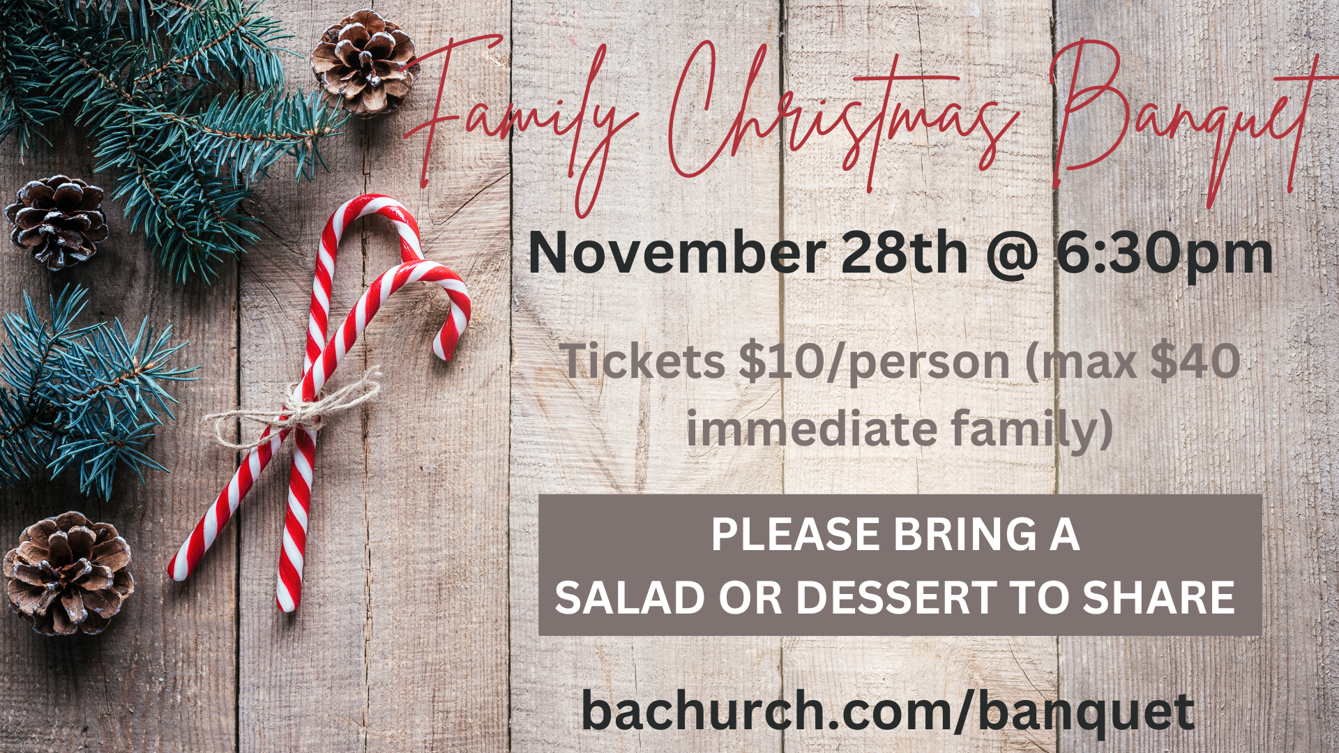 Nov 28 Fri November 28, 2025 from 06:30 PM to 10:00 PM America/Toronto FAMILY CHRISTMAS BANQUET Pastor Julie jcrawford@bachurch.com CLICK HERE TO SIGN UP