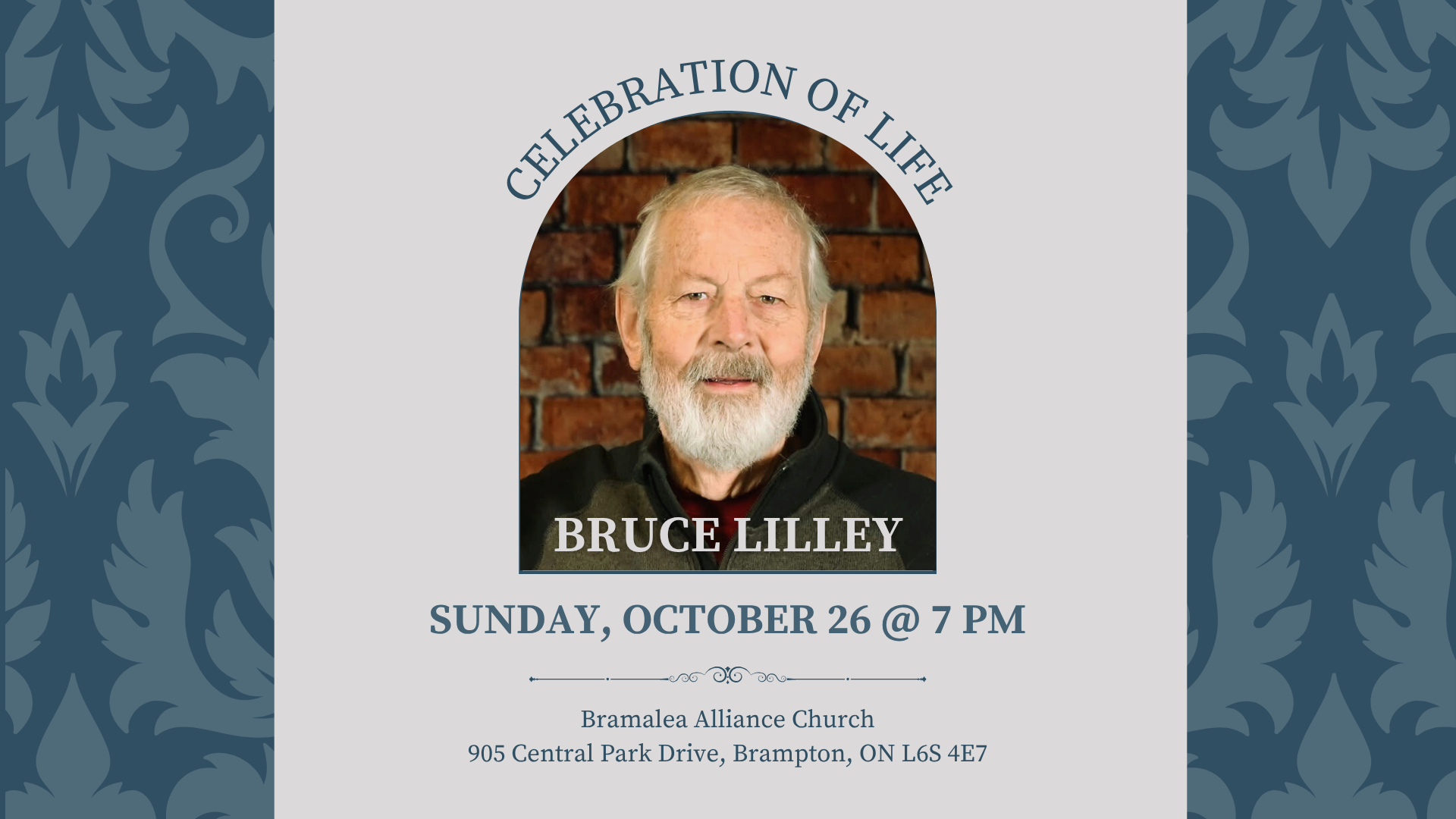 Please join us in celebrating the incredible life of our beloved Bruce Lilley. The service is on Sunday, October 26th at 7 pm, with refreshments to follow. If you are able please park at Goldcrest Public School - we are expecting a FULL house. If you are interested in bringing food, please reach out to Pastor Julie - jcrawford@bachurch.com.